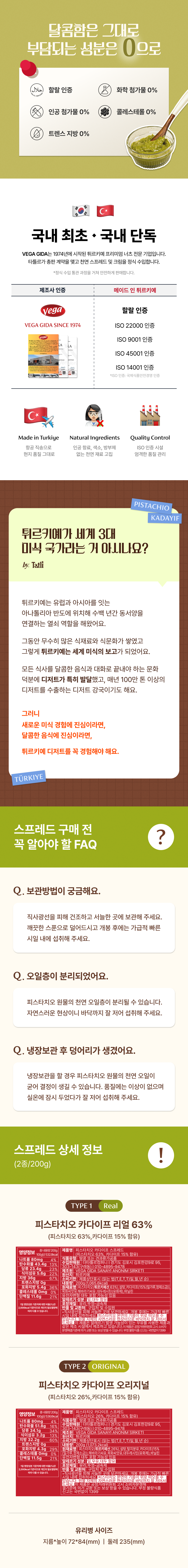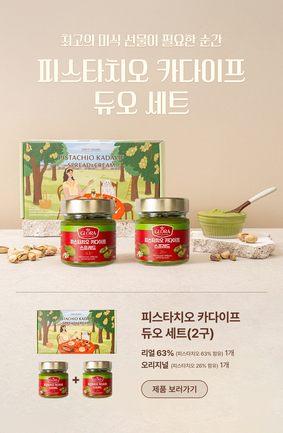 100% 튀르키예산 피스타치오와 카다이프가 황금 비율로 들어있는 피스타치오 카다이프 스프레드 2종. 피스타치오 함량에 따라 리얼(63%), 오리지널(26%) 중 택 1.