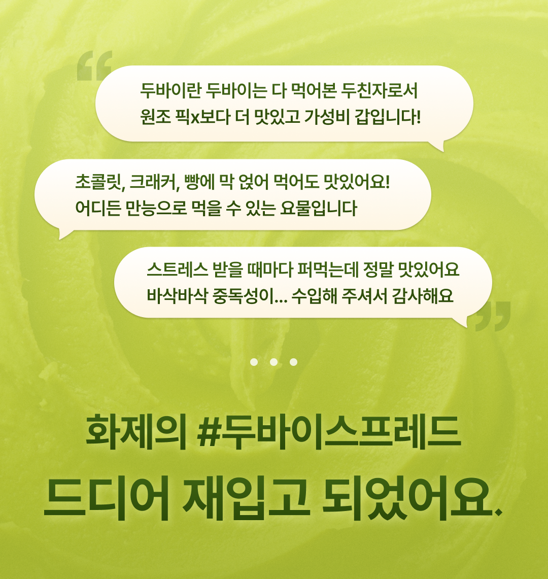 타틀르가 국내 최초•국내 단독으로 항공 직수입해 선보이는 피스타치오와 카다이프 일체형 스프레드입니다. 어디든 슥 바르면 두바이 디저트가 30초 안에 완성되는 두바이 스프레드를 경험해 보세요.