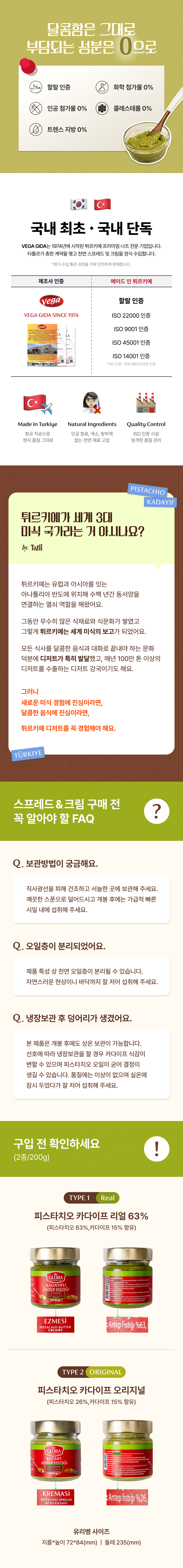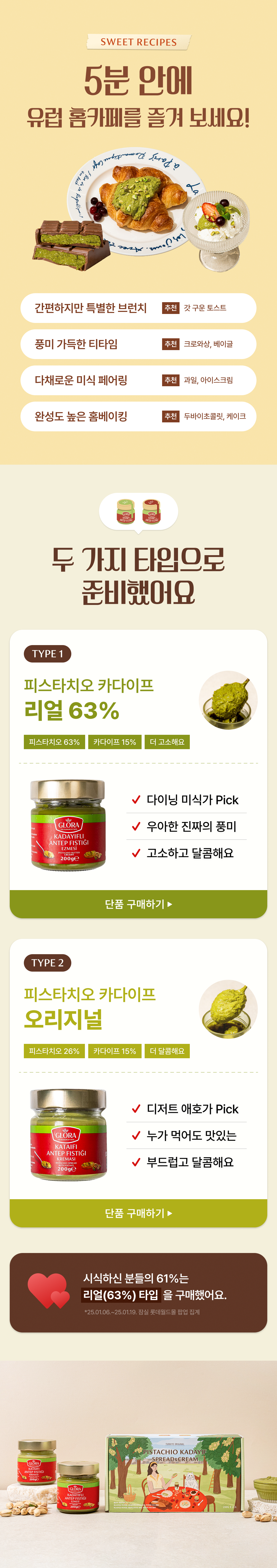 100% 튀르키예산 피스타치오와 카다이프를 황금 비율로 담은 피스타치오 카다이프 스프레드 2종. [리얼 63%] 1개와 [오리지널] 1개가 일러스트 패키지에 들어있는 듀오 세트입니다.